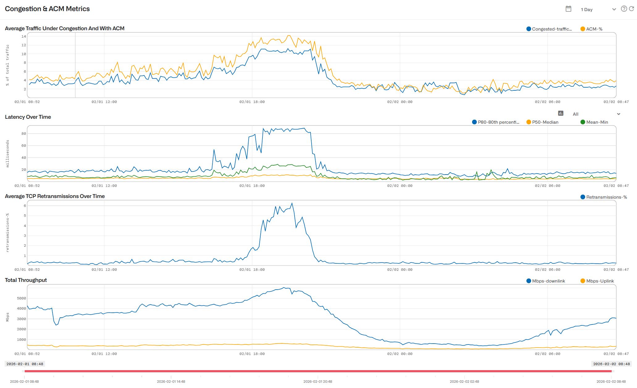 - Iltraffico medioin condizioni di congestione e con ACM mostra la percentuale di traffico in cui ACM rileva la congestione, insieme alla percentuale di traffico in cui ACM attenua attivamente la congestione.