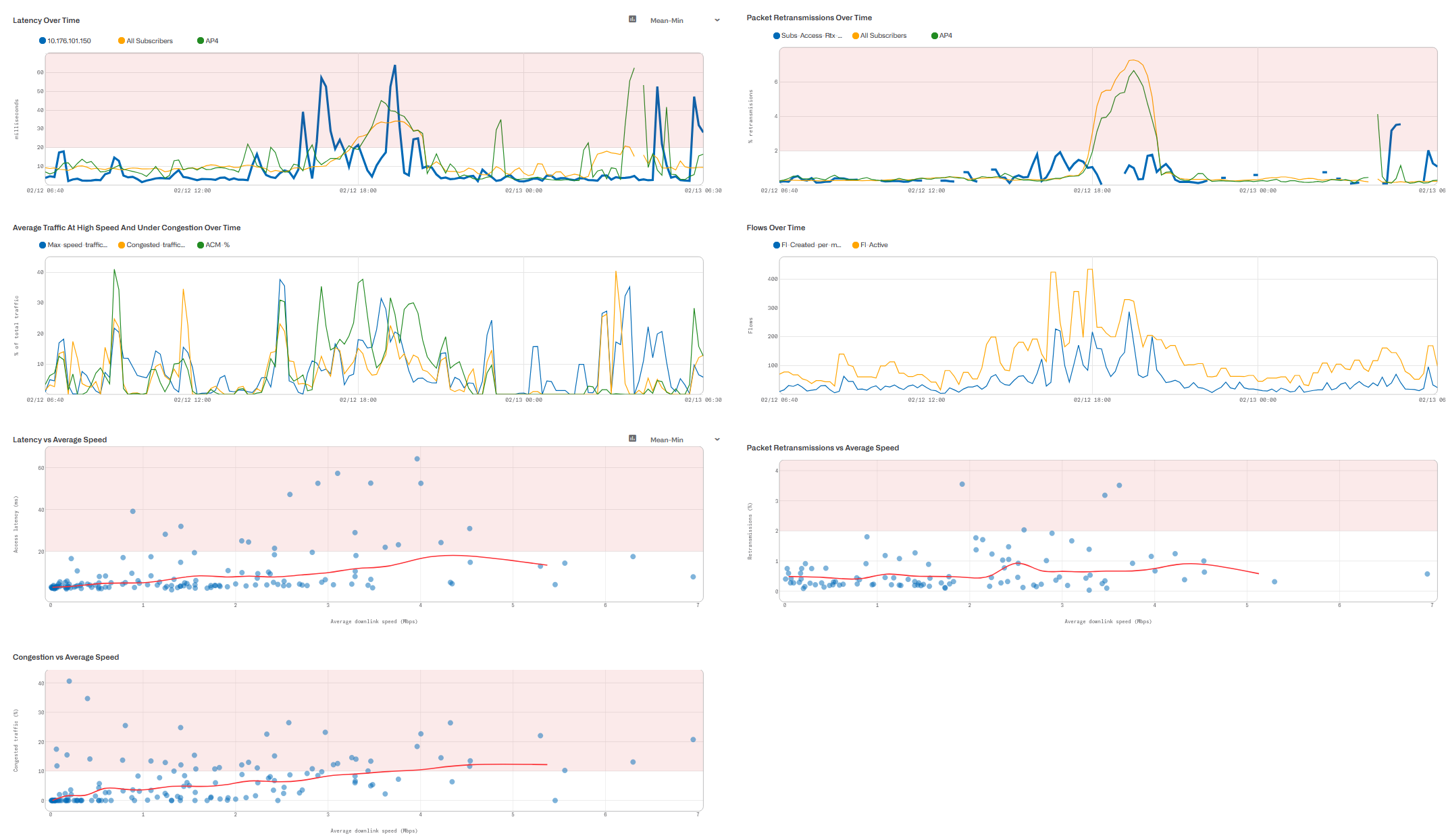 Contiene anche dei grafici a dispersione con la relazione tra la velocità media e le misure di latenza, ritrasmissione e congestione. Una linea rossa mostra la possibile correlazione tra le due. Questi grafici aiutano a identificare le velocità in cui altre metriche di QoE possono deteriorarsi (e forse a mitigarle limitando la velocità complessiva di quel gruppo).