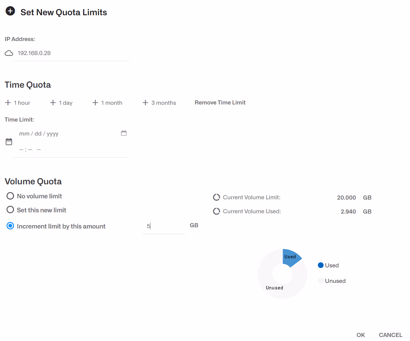 Si noti che il campo Volume corrente utilizzato informa sulla quota già esaurita. Un grafico a torta in basso a destra lo mostra graficamente.