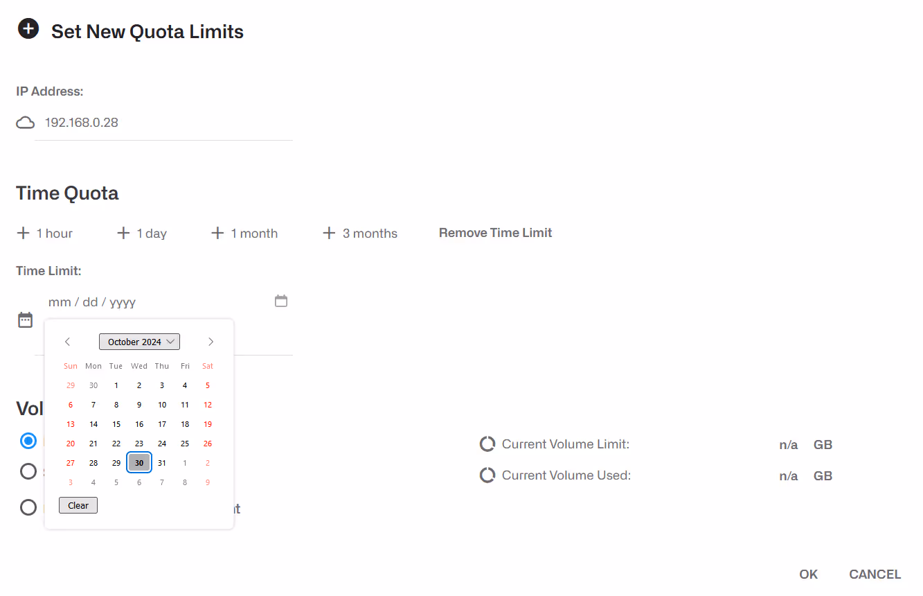 Nell'esempio precedente, ci sono tre quote di volume e due quote temporali (si noti che il mese è indicato prima del giorno, quindi 9/29/2023 è il29settembre 2023). Per le quote di volume, viene mostrato anche il volume già consumato (ad esempio, 10.0.0.3 ha una quota di 15 GB e ha consumato 20 MB).