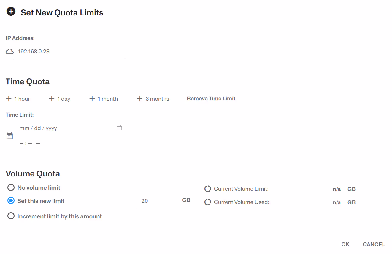 All'indirizzo IP di un abbonato possono essere associate quote di tempo e di volume. Una volta esaurita una quota, l'indirizzo IP dell'abbonato viene limitato (per impostazione predefinita, il traffico viene bloccato). A un indirizzo IP possono essere associate contemporaneamente quote di tempo e di volume, nel qual caso la restrizione avviene quando una delle quote è esaurita.