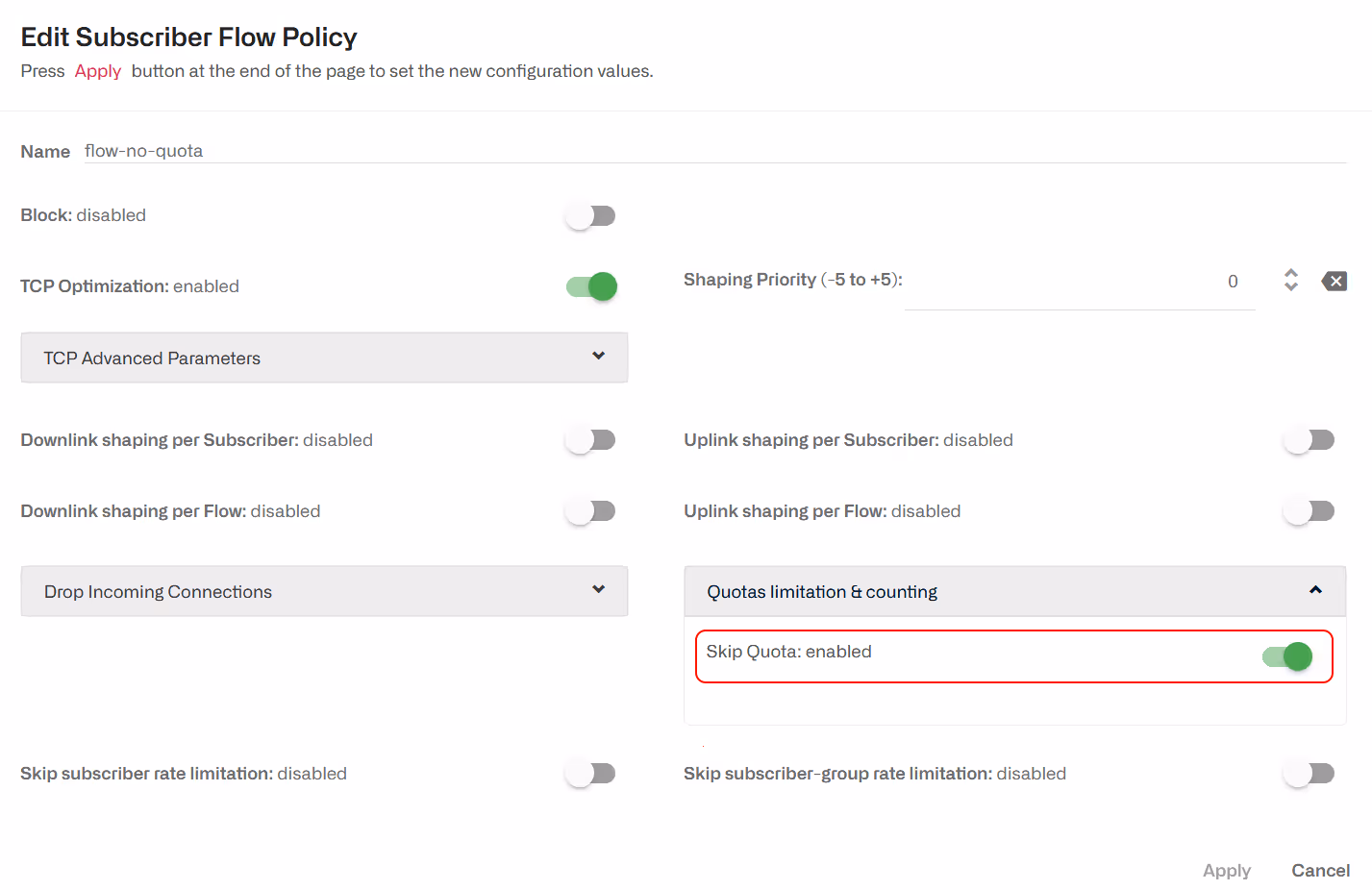 Nell'esempio seguente, due categorie di traffico devono essere escluse dal controllo delle quote (policy flow-no-quota):